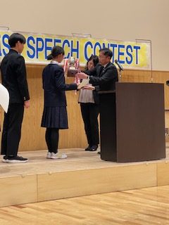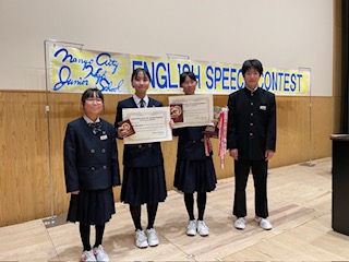 昨日、市の英語弁論大会が行われました。暗唱の部に1年鈴木悠真さん(The Wolf and the Fox)、1年桑原悠妃さん(Zoba’s Three Promises)2年髙橋凪さん(Miss Evans on the Titanic),スピーチの部に2年石黒千倖さん(Peace in a Circle of Happiness)が出場し、2年高橋さんが第3位、2年石黒さんが第1位に入賞しました。おめでとうございます。冬休み中も含め一か月以上熱心に練習した成果を発揮し、4人とも豊かな表現で堂々と発表することができました。日々挑戦し、学びを楽しむ宮中生です。