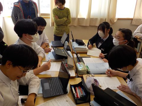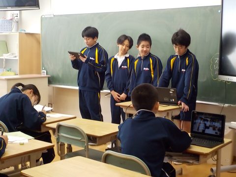 1年数学。立体の授業では折り紙で立体図形を作っていますが、初めて折り紙を触ったという人もいました。平面を立体にするのは面白いですね。英語の授業では、今年度最後の英語パフォーマンステストも行っています。いろんな形で学びを深めています。