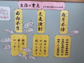 1学年運営委員会生活係では、生活の3つの重点を掲げ具体的な項目についてみんな取り組み、振り返りをしています。人間は環境の動物。環境も心もすっきりと整えて気持ち良く過ごしたいものです。