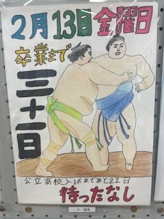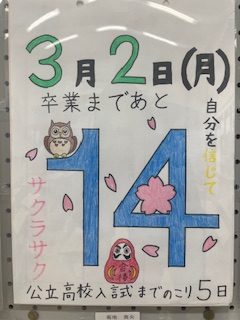 今年度もあとわずか。学習をまとめ、作品を完成させる時期です。2年美術の素敵な絵、写真たて、コースターなどが展示されています。物事を最後までやり切ること、そしてやったことを通して今の自分を振り返ること。立志式を終えた2年生の後ろ姿から、次への”志”を感じた6時間目です。