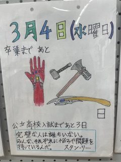 天候にも恵まれ、たくさんの保護者の皆様にご来校頂きました。1年生は、総合学習地域探究の発表会、2年生は、立志式と絵馬作成・合唱発表、3年生は国語と理科の授業でした。生き生きと仲間と学び、表現し一年間の成長を見ていただけたかと思います。保護者の皆様ありがとうございました。今年度も残りわずかですが、どうぞよろしくお願いいたします。
