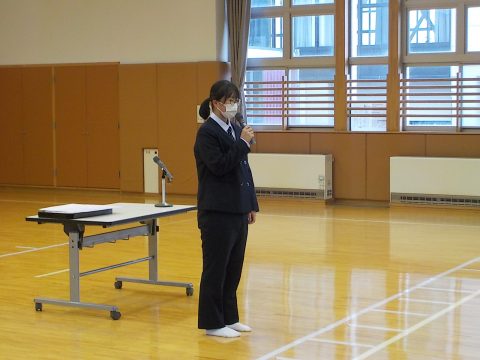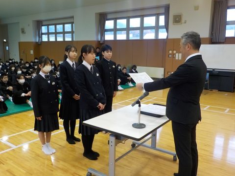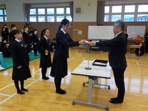全校朝会で、中体連決勝大会の報告、後期中間テスト努力賞・市短歌大会表彰が行われました。2時間目は、3年2組が宮内双葉保育園で保育実習を行いました。いよいよ雪の便りが来そうな一日ですが、まごころ込めた取り組みで寒さに負けず頑張る宮中です。
