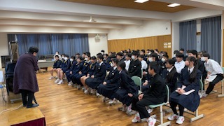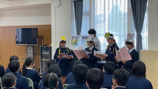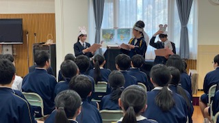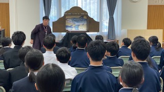 月曜日、山形県紙芝居研究会の活動でご活躍の折原由美子先生にご来校頂き、紙芝居の読み聞かせ講座をして頂きました。情感たっぷりに演じられる紙芝居。会場が一体となって、あっという間に先生の紙芝居の世界へ引き込まれました。後半は生徒が「てぶくろ」を上演。突然でしたが、とても上手に演じ、折原先生からも褒めていただきました。言葉が”沁みる””伝わる”には、よい聞き手が大事。聞く態度もすばらしく、まごころ溢れる楽しい時間となりました。折原先生ありがとうございました。