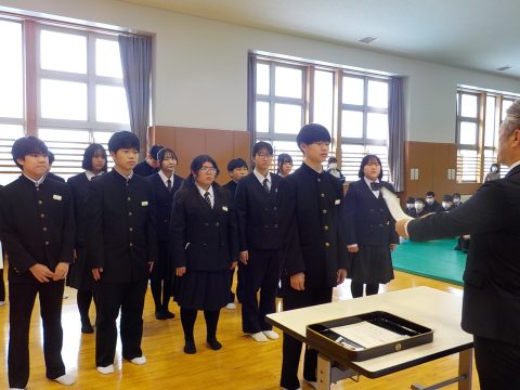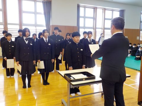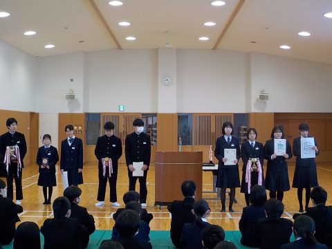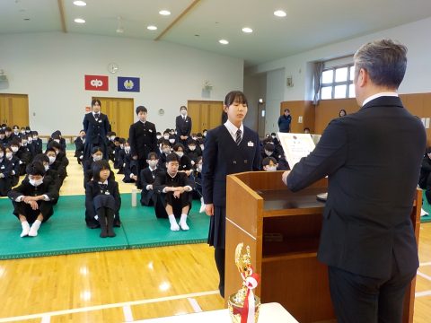 今日の全校朝会では、各種表彰と大会結果報告、3学期学級正副会長の認証が行われました。最後の3学期、どのように自分たちが高まり次へとつなげるのか、一人一人力強く意気込みを発表した正副会長。とても頼もしく感じました。その日のベストを尽くすことがよりよい明日へつながるなあと生徒の皆さんの姿や言葉から学んだ朝でした。