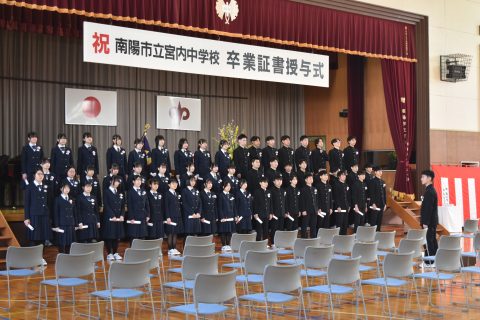 温かな日差しが降り注ぐ今日の佳き日、第16回卒業証書授与式が挙行されました。凛とした雰囲気の中での立派な返事、決意溢れるまなざしでまっすぐ前を見つめる卒業生の姿。粟野一颯さんの答辞・狩野律葵さんの送辞、在校生の態度も素晴らしいものでした。卒業生が大切にしてきた合唱。アカペラの卒業生合唱が体育館に美しく響きました。ご臨席を賜りました南陽市教育委員会教育長 堀裕一様、PTA会長 星雄大様、南陽市議会議長 遠藤榮吉様をはじめとする市議会議員の皆様、来賓の皆様ありがとうございました。保護者の皆様おめでとうございます。そして3年間ありがとうございました。卒業生65名の皆さん、自分の強みを誇りにし、自分の言葉を大切にして、それぞれへ大空へ大きく羽ばたいて下さい。ご卒業おめでとうございます。