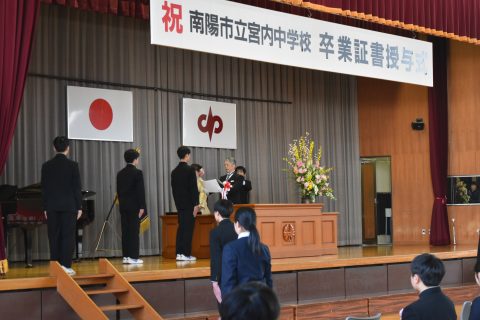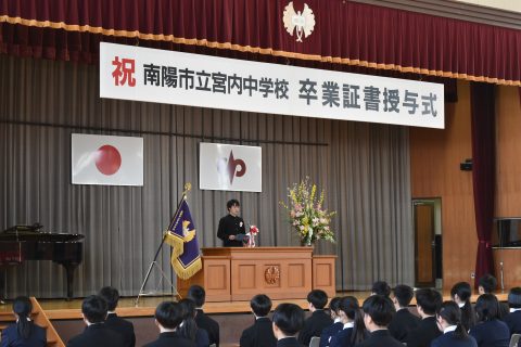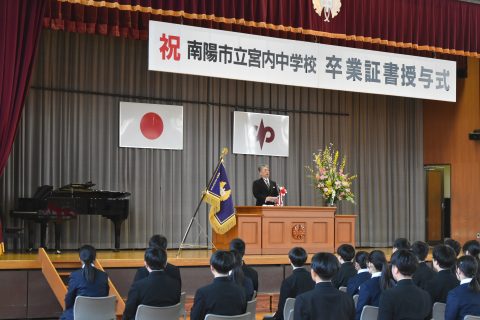 温かな日差しが降り注ぐ今日の佳き日、第16回卒業証書授与式が挙行されました。凛とした雰囲気の中での立派な返事、決意溢れるまなざしでまっすぐ前を見つめる卒業生の姿。粟野一颯さんの答辞・狩野律葵さんの送辞、在校生の態度も素晴らしいものでした。卒業生が大切にしてきた合唱。アカペラの卒業生合唱が体育館に美しく響きました。ご臨席を賜りました南陽市教育委員会教育長 堀裕一様、PTA会長 星雄大様、南陽市議会議長 遠藤榮吉様をはじめとする市議会議員の皆様、来賓の皆様ありがとうございました。保護者の皆様おめでとうございます。そして3年間ありがとうございました。卒業生65名の皆さん、自分の強みを誇りにし、自分の言葉を大切にして、それぞれへ大空へ大きく羽ばたいて下さい。ご卒業おめでとうございます。